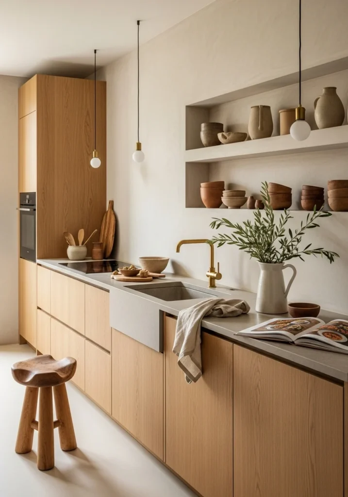 Create minimal rustic style using warm lime-wash plaster walls, seamless handleless oak cabinetry, and completely integrated appliances. Use thin honed stone countertops with recessed shelving for curated pottery displays.