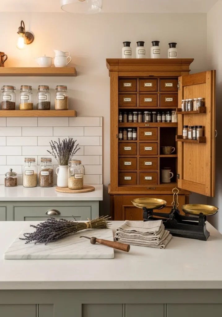 Repurpose antique apothecary cabinets as pantry storage and spice displays. Pair with white subway tile splashes, soft sage shaker islands, and oak open shelving with labeled storage jars.