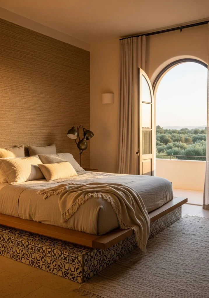 Create luxurious bedrooms with warm sand plaster walls, low oak platform beds dressed in layered linens, and arched doors opening to private balconies overlooking gardens or groves.