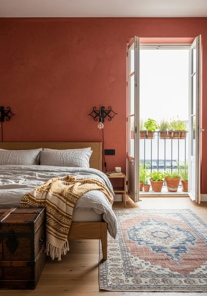 Create luxurious guest rooms with terracotta-toned plaster accent walls, low oak beds with layered linen bedding, and handwoven throws in ochre and cream. Add antique chests and wrought-iron wall sconces.