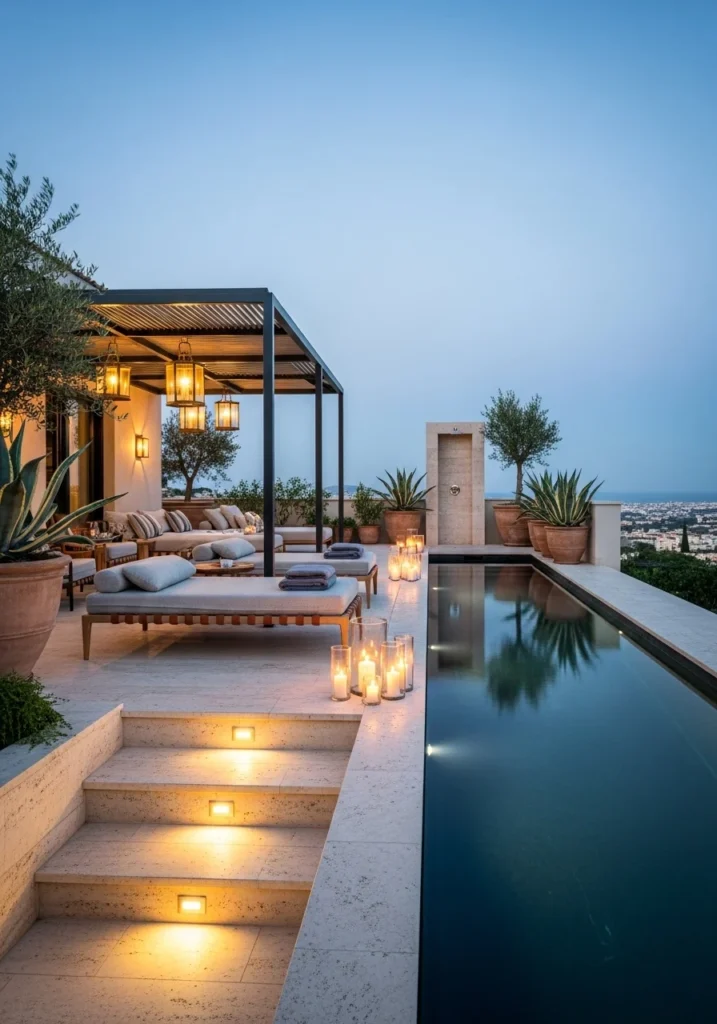Add woven runners leading into the house, flanking wrought-iron lanterns, and small stone benches with neutral linen cushions. This immediately establishes the indoor-outdoor connection that defines Mediterranean living.