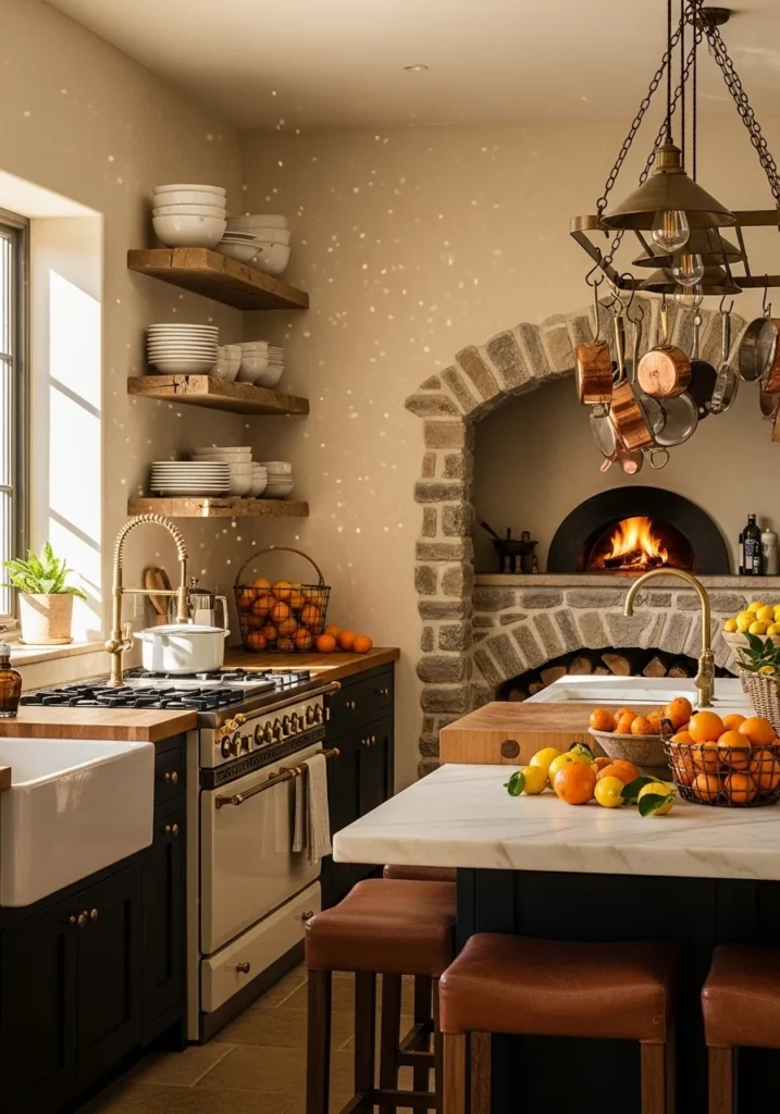 Feature stone-clad wood-fired pizza ovens nestled into arched cooking alcoves with warm plaster surrounds and reclaimed oak shelving. Use butcher-block prep counters with warm alabaster surfaces.