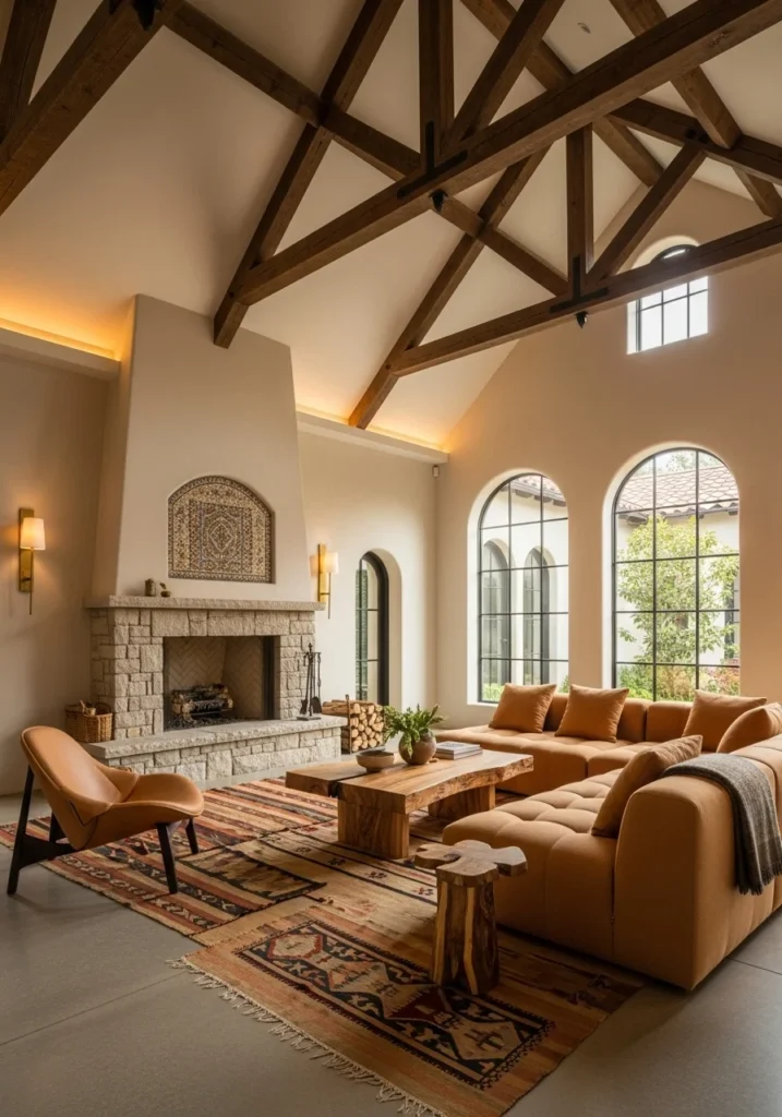 Create luxury living spaces under vaulted ceilings with dark oak beams, warm plaster walls, and large stone-clad fireplaces with mosaic insets. Use low linen modular sofas in warm sand tones facing olive-wood coffee tables.