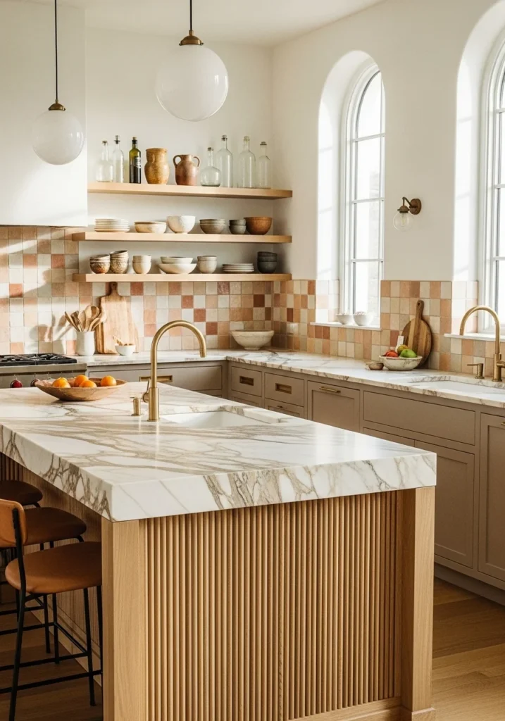 Center your kitchen on bookmatched honed marble waterfall islands with warm beige veining and integrated prep sinks. Use warm taupe lacquered cabinetry with fluted oak island bases and hand-glazed terracotta tile backsplashes.