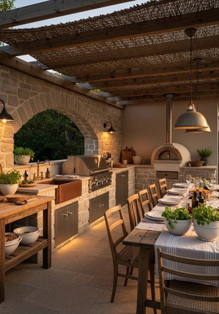 Build stone-clad outdoor counters with copper sinks, built-in grills, and pizza ovens under arched openings. Use timber pergolas with woven shade, brass taps, and reclaimed wood prep tables.