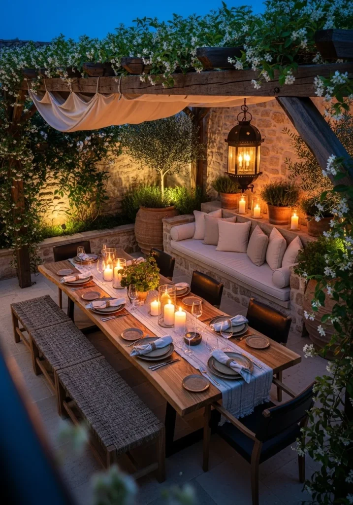 Include built-in stone banquettes with plush cushions, terracotta planters, and iron hanging lanterns. Style with hand-thrown plates, linen napkins, and runners for authentic outdoor entertaining.
