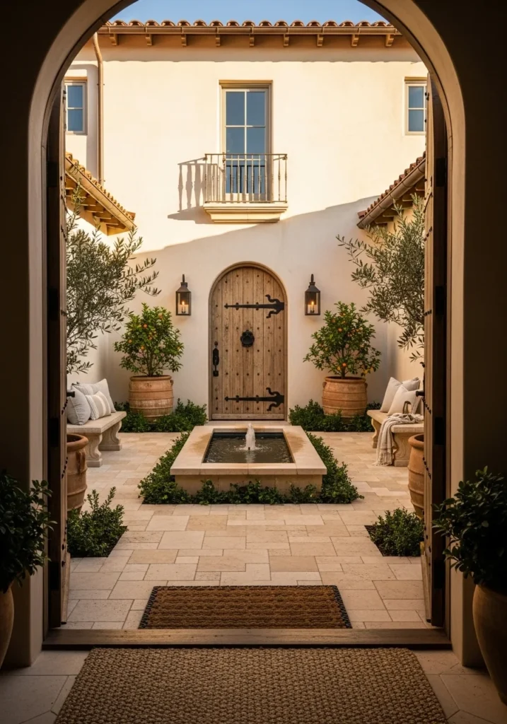 Design your entry with honey-colored travertine paving, a central reflecting fountain, and sun-blushed stucco walls with soft limewash texture. Use reclaimed wood front doors with oversized wrought-iron hardware while planted terracotta pots with olive trees frame the entrance.