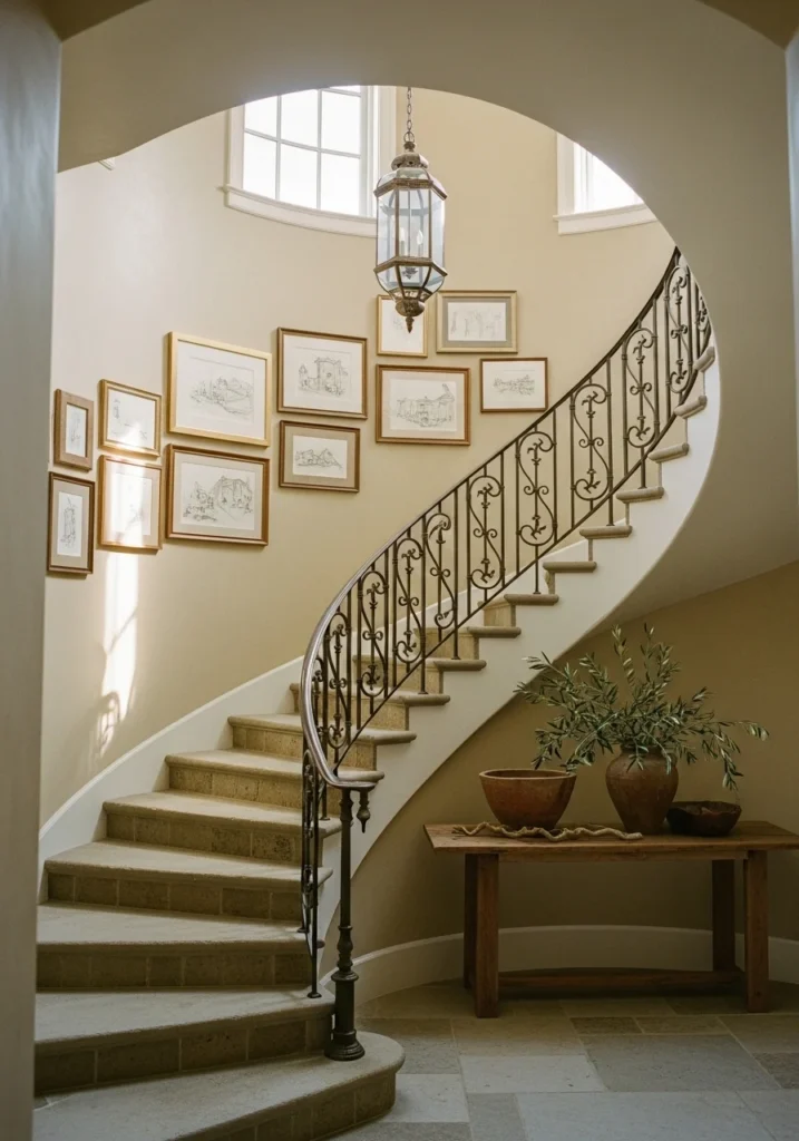 Design entry stairs in tumbled stone with wrought-iron balustrades featuring artisan scrollwork and plastered walls in sandy beige. Create gallery walls of framed coastal sketches with pendant lanterns in stairwell shafts.