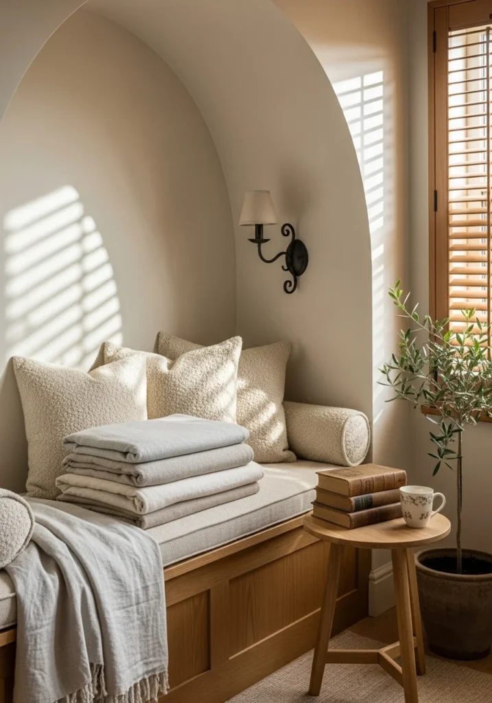 Design reading spaces recessed in arched alcoves with built-in oak benches, plush boucle cushions, and layered linen throws. Add wall-mounted wrought-iron sconces with small oak side tables.