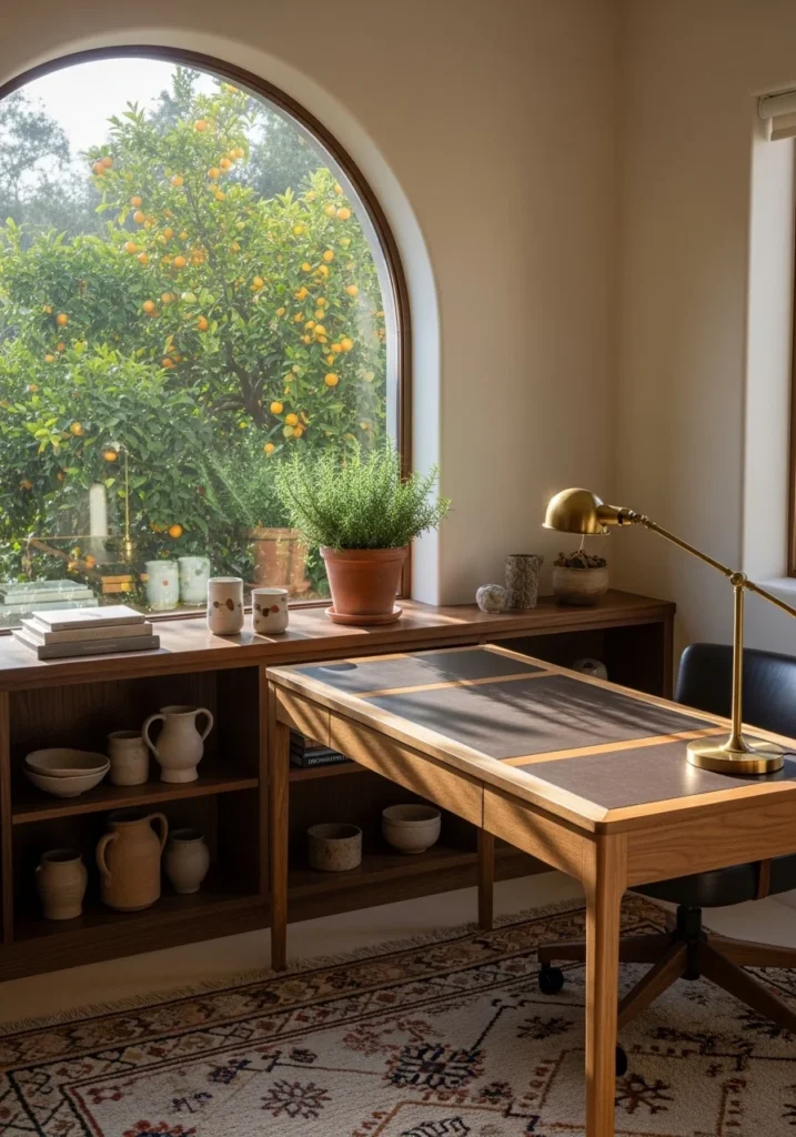 Add brass task lamps and curate shelves with ceramics and potted rosemary. The connection to garden views makes work feel less isolated and more connected to the Mediterranean lifestyle.