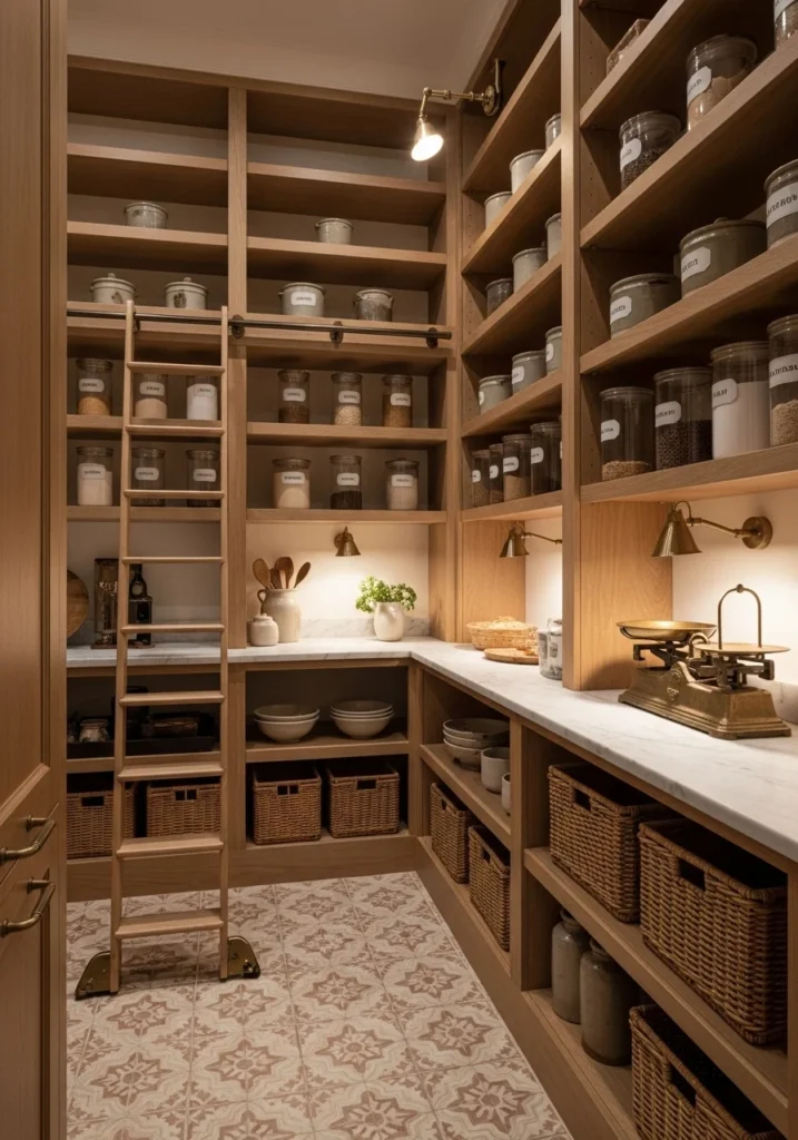 Design refined pantries with floor-to-ceiling open timber shelves, labeled glass canisters, hand-thrown pottery, and antique brass hardware. Use warm plaster walls with encaustic tile floors in muted terracotta and cream.