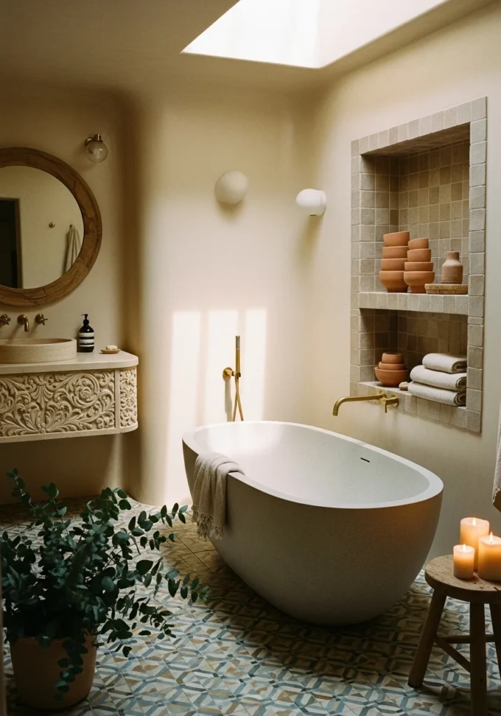 Include built-in tiled niches with stacked terracotta pots and rolled linen towels. Skylights above tubs with potted eucalyptus and wooden stools holding candles create genuine spa atmospheres.