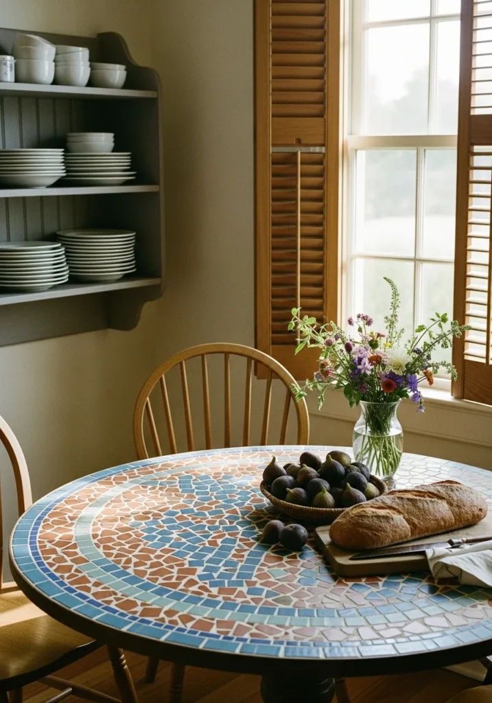 Design intimate breakfast spaces with round wooden tables featuring custom mosaic tile tops in warm blue and terracotta tones. Use spindle-back chairs with open shutters bringing in morning sun.
