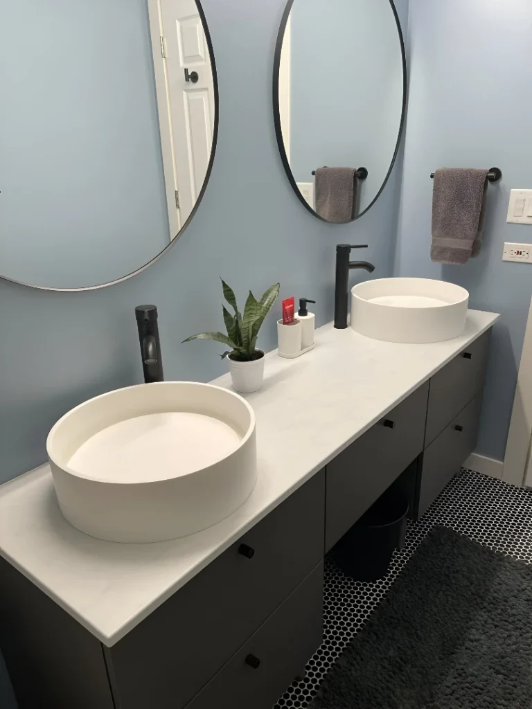 u/S4BB created this sleek double vanity situation with a floating gray cabinet, white quartz countertop, and two round white vessel sinks. The black matte faucets add contrast, while those large round black-framed mirrors create symmetry and visual impact.