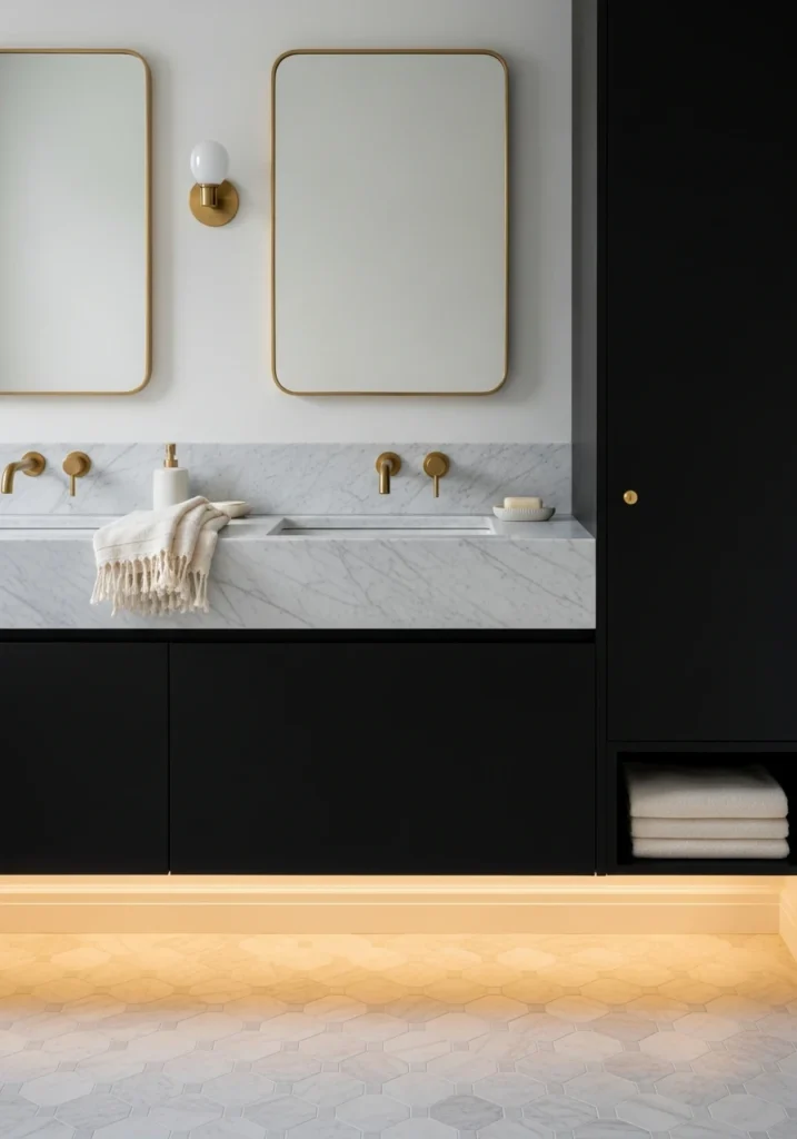 This wall-mounted matte-black lacquer vanity built from flat-pack cabinets gets a serious upgrade with a bookmatched honed Carrara marble top and integrated under-mounted basins. Slim brass mixer taps and a thin brass mirror frame add that luxe touch without overwhelming the clean lines.