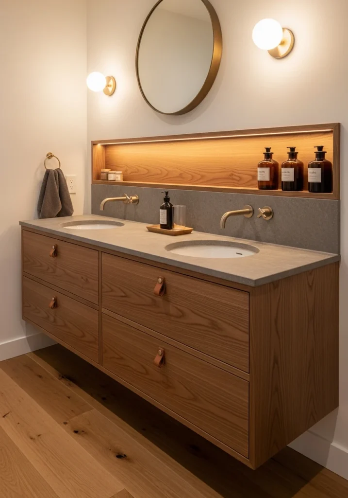 A round brass mirror hangs above, while integrated warm shelf lighting in a niche displays glass apothecary jars without cluttering the counter. Warm oak plank flooring and soft wall sconces create layers of warm light that make the whole space feel cozy.