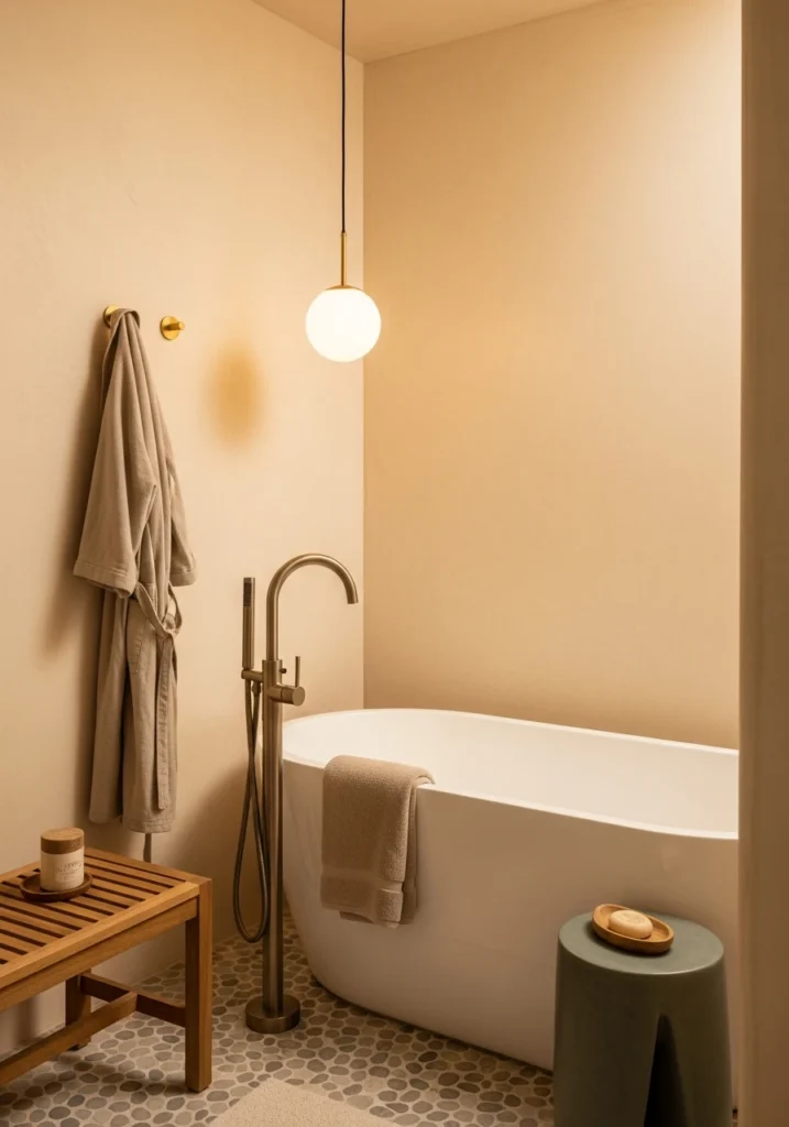 That slightly lowered angle captures the plaster texture and how intimate the whole tub area feels. This is spa-level relaxation built into what’s probably a pretty standard bathroom footprint.