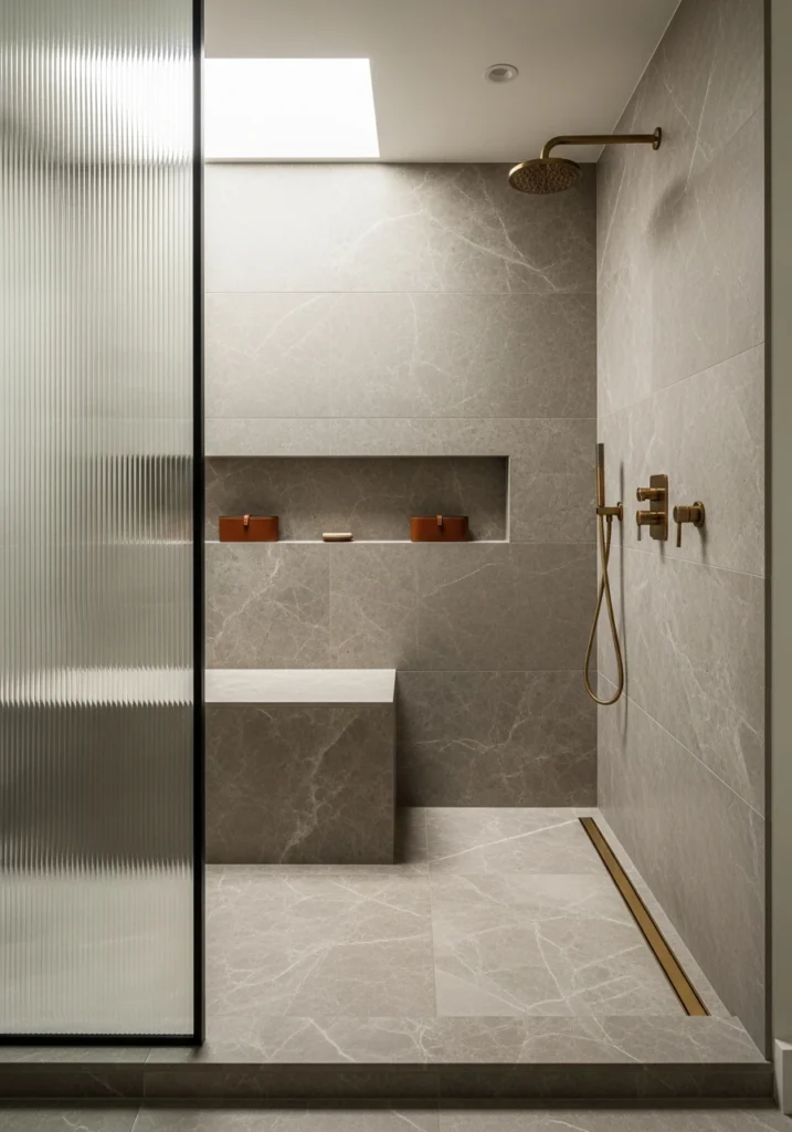 The walk-in shower with floor-to-ceiling reeded glass partition (black-framed for contrast) creates privacy without making the space feel closed off. Large-format warm-gray marble tiles cover the walls, and a built-in bench with honed marble top provides seating plus a practical ledge.
