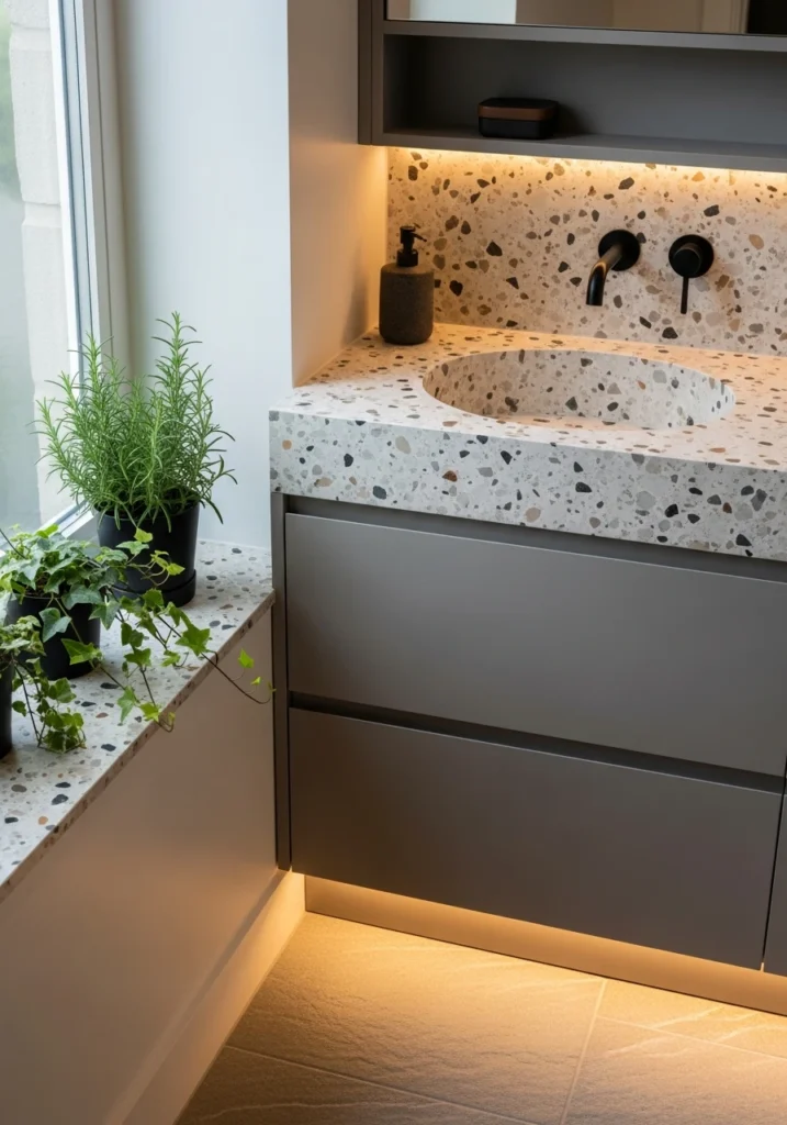 This terrazzo countertop with inlaid quartz flecks over a compact vanity brings color and pattern in the most durable way possible. Inset oval basins keep the profile low, and here’s the genius move—a built-in narrow planter strip at the window edge planted with rosemary and small ivy.