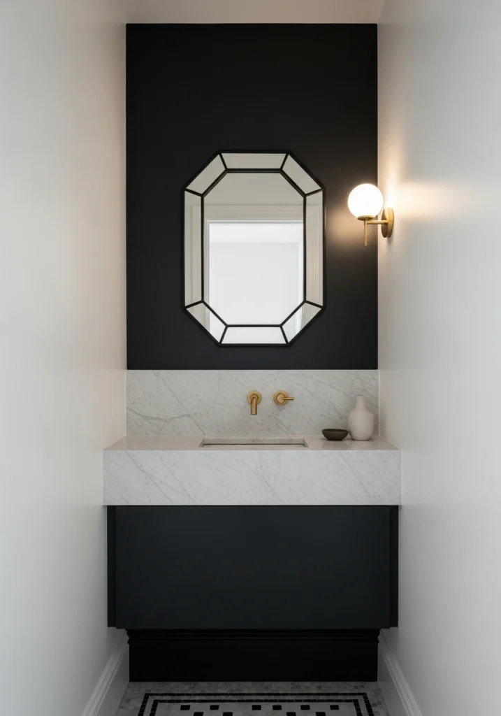 Crisp white walls get drama from a single deep-charcoal painted accent wall behind a narrow marble ledge basin. The faceted black-rim mirror creates architectural interest, paired with a thin brass faucet that adds just enough warmth.