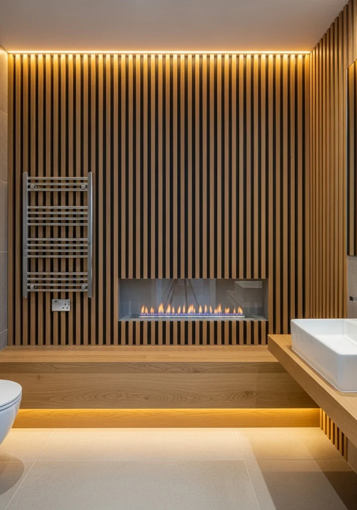 Here’s where things get really interesting—a feature oak slatted wall with narrow vertical channels conceals a heated towel rail behind the slats, so form meets serious function. An inset linear gas-plug fireplace niche at bench height (with safety glass) adds both warmth and ambiance.