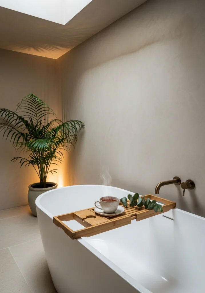 A centered freestanding matte-white tub gets practical with an oak bathtub tray holding a ceramic teacup and trimmed sprig. The corner gets planted with a tall narrow-leaf plant in a glazed pot, bringing life and air-purifying benefits.
