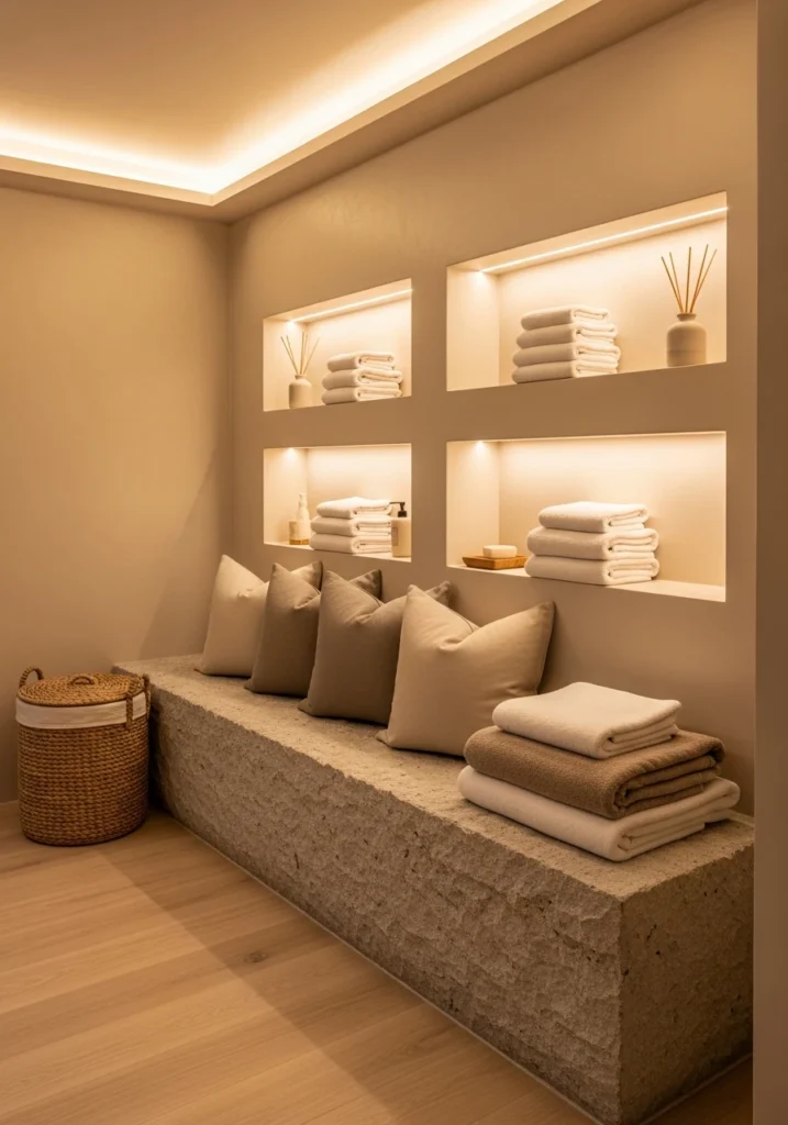 A long stone bench with plush neutral cushions and folded thick towels creates a lounging spot that’s actually useful. Wall niches with soft warm glow hold stacked terry and small ceramic diffusers, while a woven seagrass basket handles laundry.