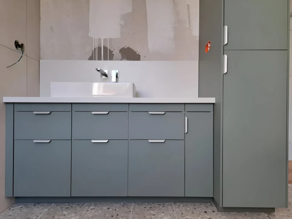 u/markusReddited captured this bathroom mid-renovation, and even unfinished it shows the bones of a great IKEA hack. That gray-blue vanity with white countertop and vessel sink looks clean and modern, with plenty of drawer storage underneath.