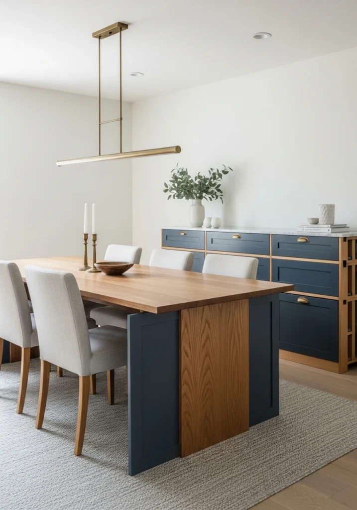 This setup is a masterclass in making IKEA work harder. The long walnut dining table sits on a base built from painted IKEA cabinet carcasses—matte navy on the lower sections with warm oak veneer wrapping the island ends for that two-tone effect.