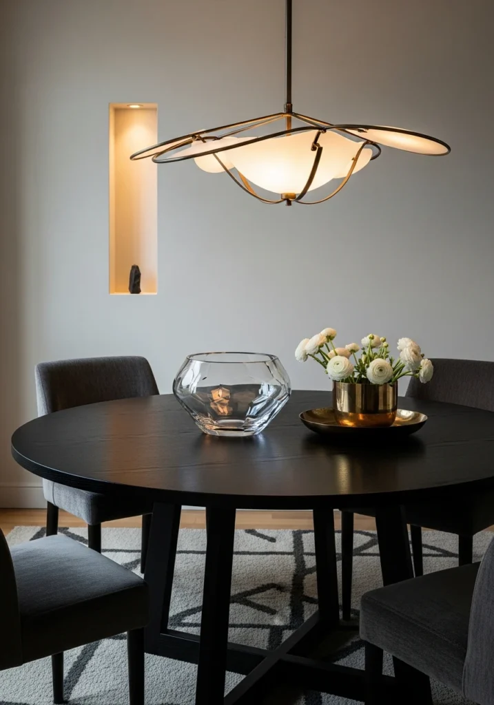 Charcoal velvet dining chairs add softness against the dark wood, while the sculptural bronze pendant with frosted infill provides focused lighting without being too literal. A hand-tufted wool rug in warm gray anchors everything, and those plaster walls with a single narrow recessed niche lit with warm accent lighting add architectural interest.