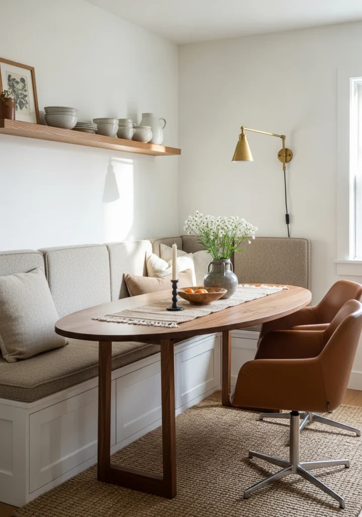 A crescent walnut dining table tucks partly into the banquette, with two leather swivel chairs sitting opposite for flexibility. The woven runner, brass wall sconce for reading, and floating oak shelf above for ceramics all add layers of thoughtful detail.