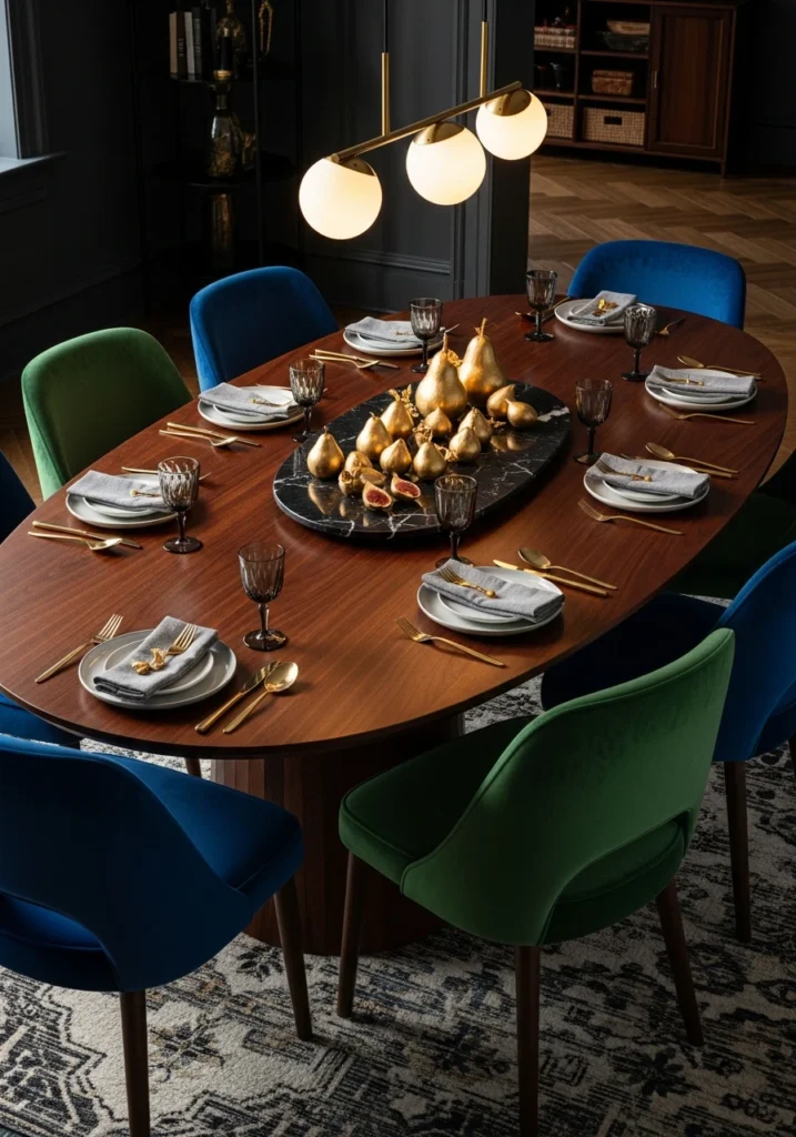 Jewel-Toned Velvet & Dark Walnut Contrast