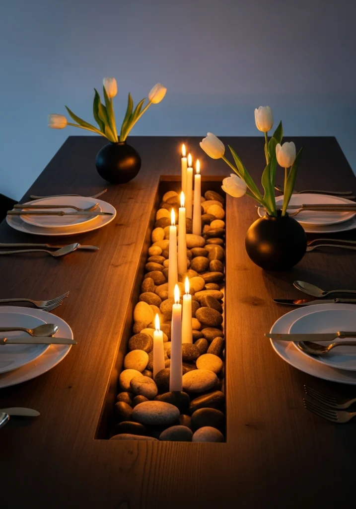 Here’s where things get really creative—this dark-wood tabletop has a recessed linear candle trench integrated right into it, filled with river stones and narrow white tapers. Place settings feature porcelain plates and sculptural hammered-brass cutlery that’s basically jewelry for the table.