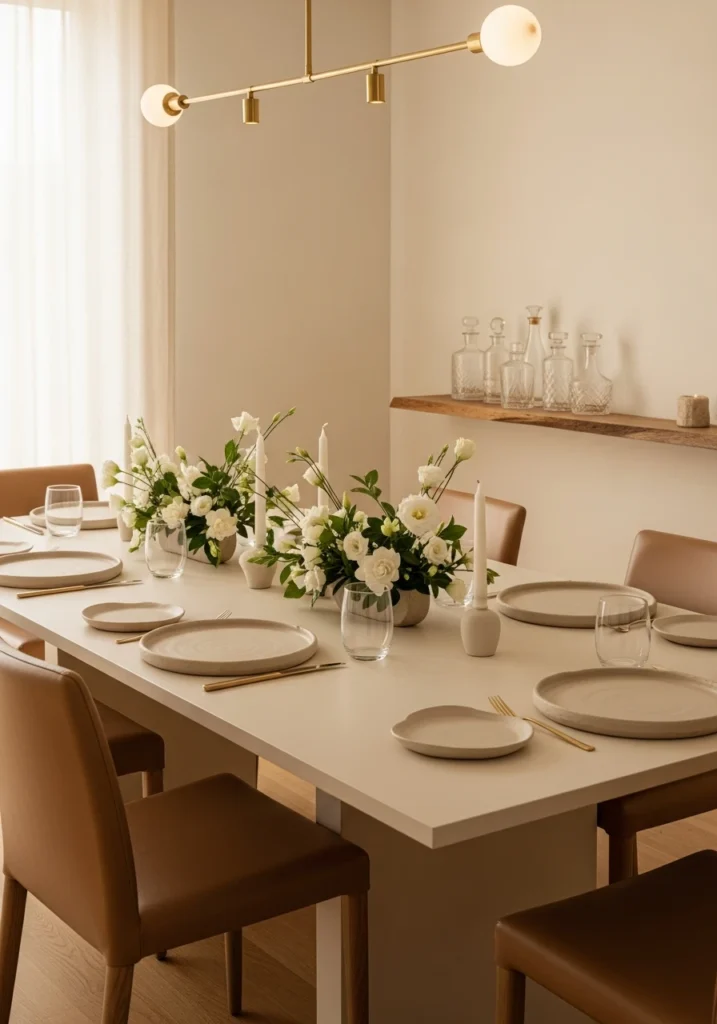 The warm-ivory palette here—ivory-lacquer table, hand-thrown matte clay chargers, low ivory floral arrangements with gardenias and lisianthus—creates this serene, elevated neutral dining space. Tan leather dining chairs add just enough warmth without disrupting the monochrome vibe.