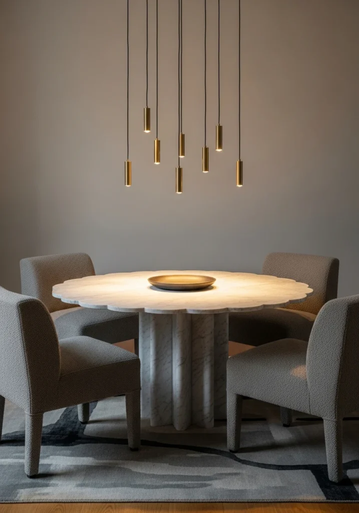 This round marble pedestal table with its scalloped-edge tabletop paired with four armless upholstered chairs in warm gray bouclé feels both classic and modern. The real star, though, is the constellation of small pendant nodes hung at varied heights in brushed brass.