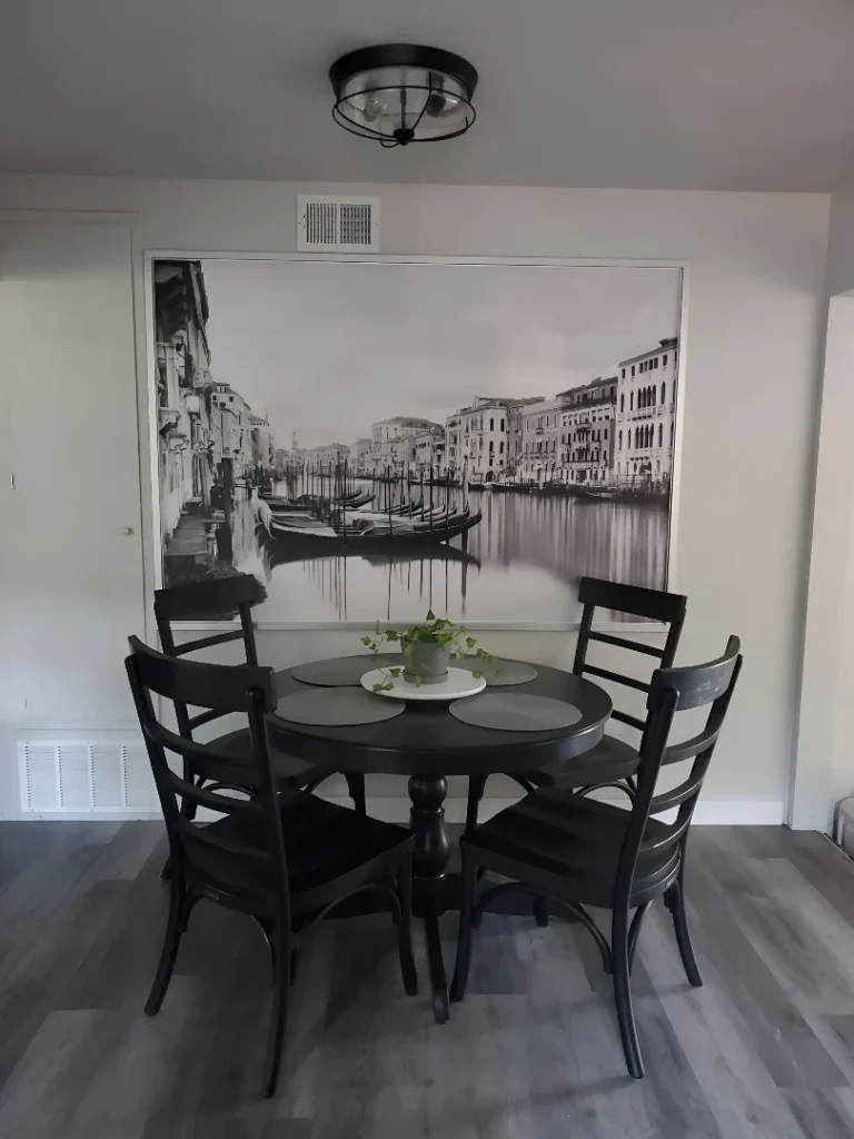 u/deJENNerette went bold with this black round pedestal table paired with matching black ladder-back chairs. What really makes the space, though, is that massive black-and-white Venice mural covering the entire wall—gondolas, canals, classic architecture.