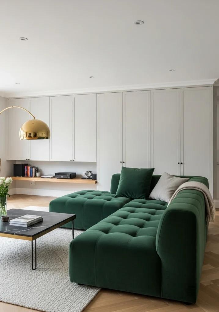 Large reconfigured modular sofas reupholstered in deep-emerald velvet completely hide their IKEA origins. Arranging them into L-shapes facing seamless built-in media walls made from painted modular cabinetry creates custom-looking room layouts.
