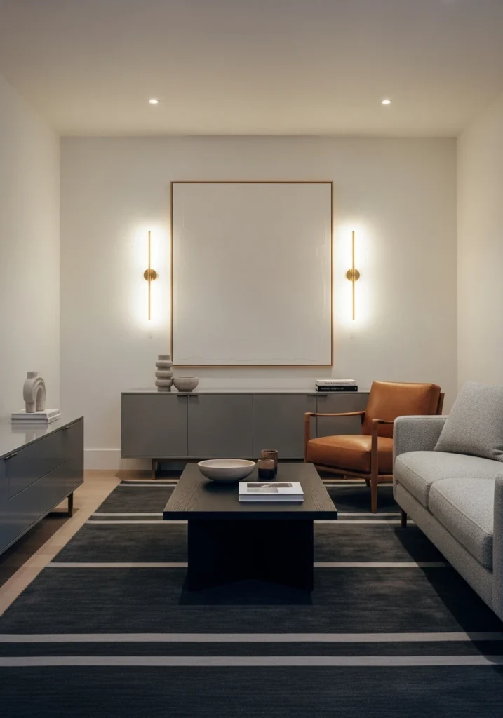 Blackened-oak coffee tables and slim brass sconces continue the refined material palette. Narrow LED picture lights highlighting large-scale abstract canvases turn the room into a gallery, and charcoal layered rugs add depth underfoot.