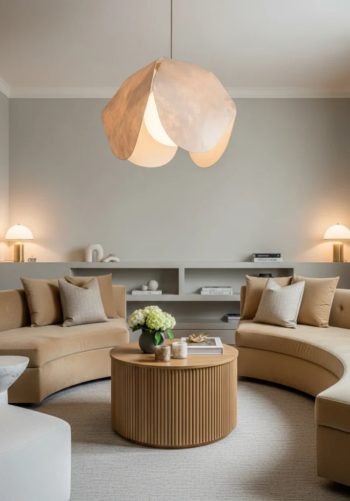 Semi-circular low sofas in sand velvet create conversation pits around round fluted-wood coffee tables. Oversized sculptural pendants in soft gold above become focal points, and low-pile neutral rugs ground everything.