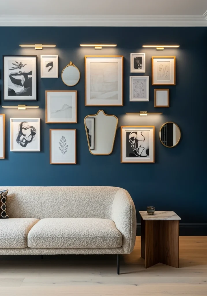 Tall gallery walls using modular picture rails with mixed-scale prints and mirrors create museum-like displays. Deep navy accents behind galleries make the frames pop, and slim-profile sofas in oatmeal boucle keep seating understated.