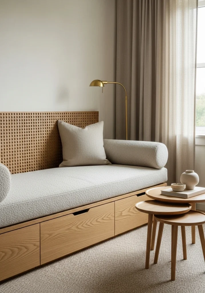 Elegant window daybeds made from modular drawer bases topped with custom cushions in thick boucle create reading nooks or afternoon nap spots. Textured timber slatted panels behind add warmth and visual interest.