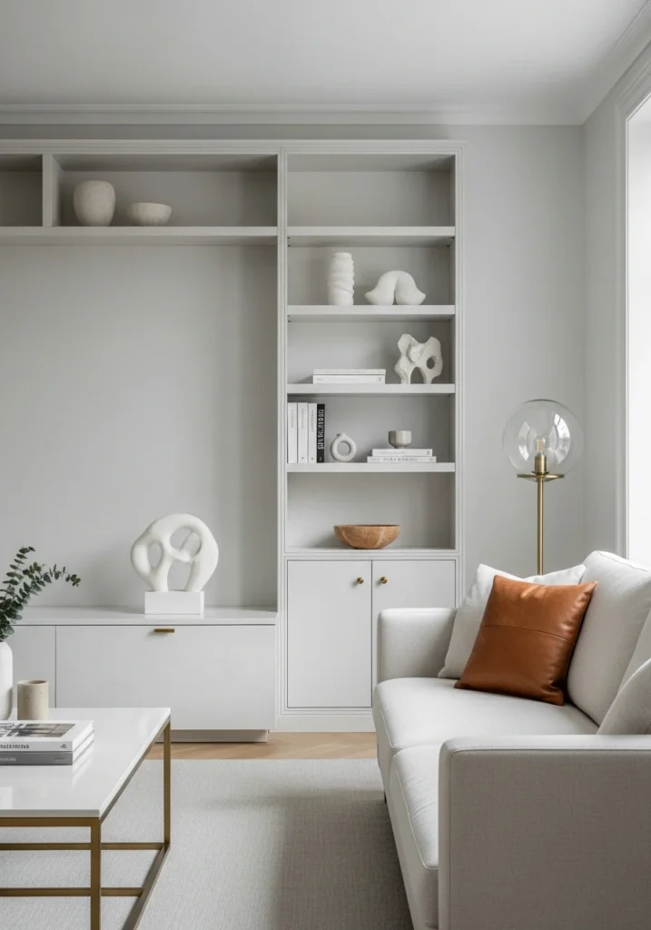 Glossy off-white built-in shelving and lacquered low media cabinets create seamless storage. Ivory linen sofas with camel leather accent pillows stay neutral with just enough warmth, and brass-trim coffee tables add metallic shine.
