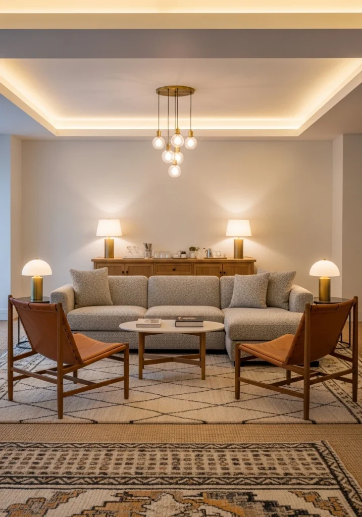 This approach feels like boutique hotel living rooms because the mixed seating and layered lighting create different zones and moods within one space. Nobody sits in the same spot all the time, and the variety encourages movement.