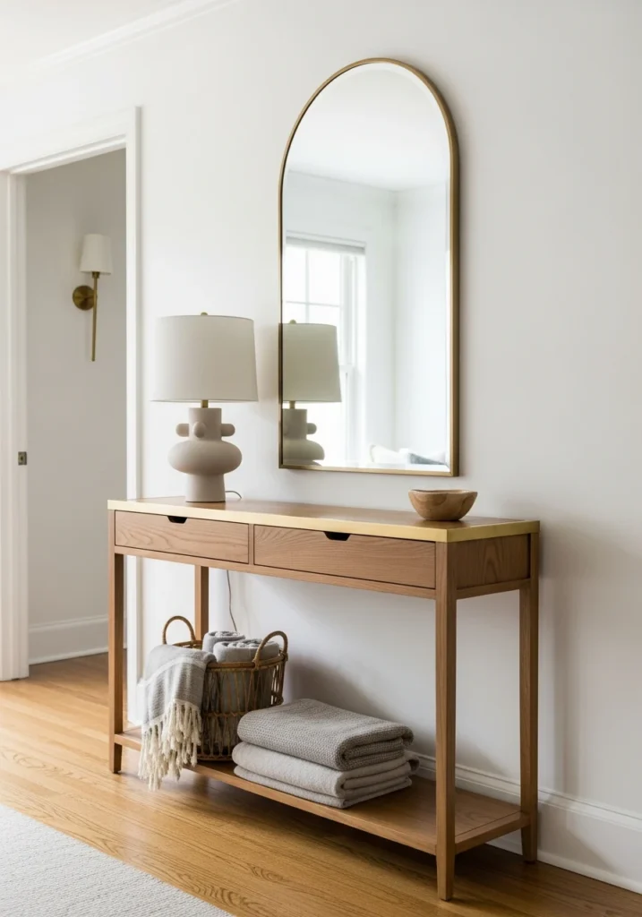 Slim consoles built from upgraded flat-pack drawers with hand-stained oak tops and brass edges create entry moments that set the tone. Oversized arched mirrors with thin brass rims above make spaces feel larger and add light.