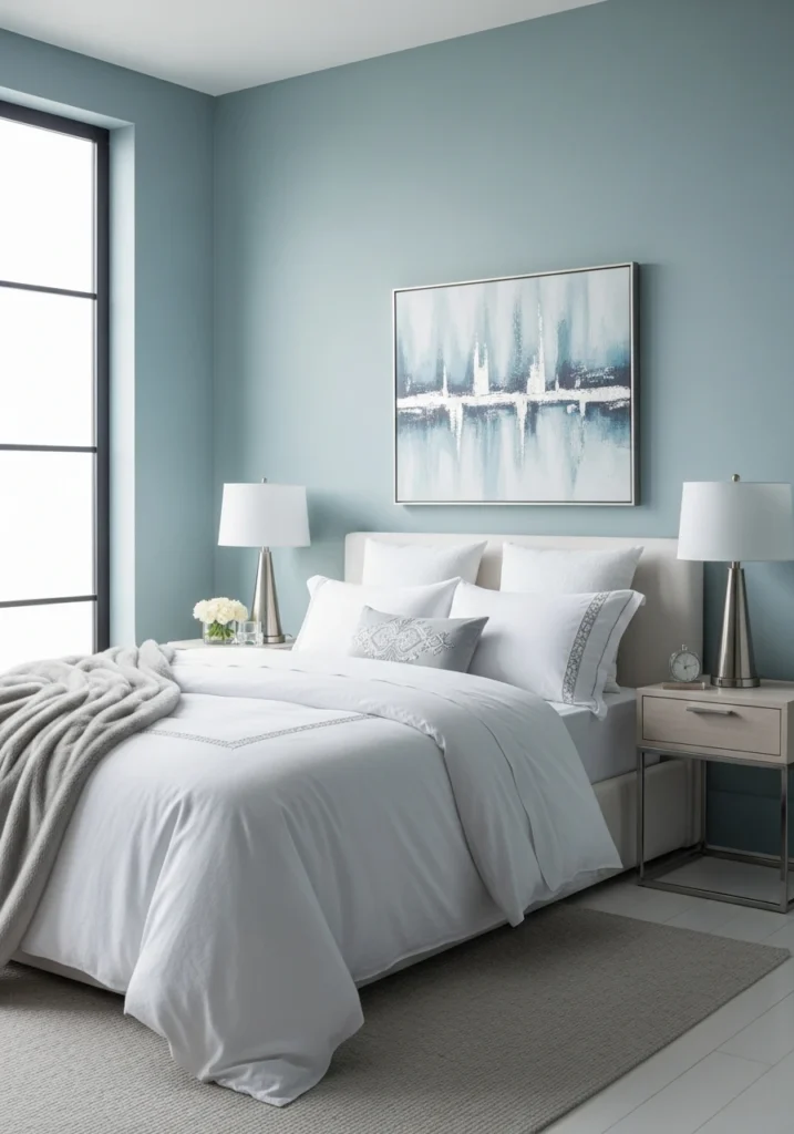 Winter bedroom perfection. Soft fog-blue wall treatments bring color without overwhelming the calm atmosphere. Chalk-white bedding layers create that cloud-like comfort, while cool silver accents add just enough shine. Minimal furniture keeps the focus on the palette itself.