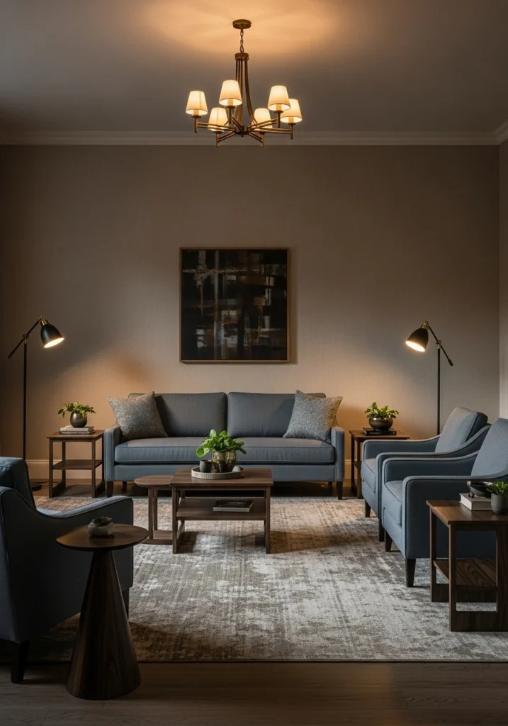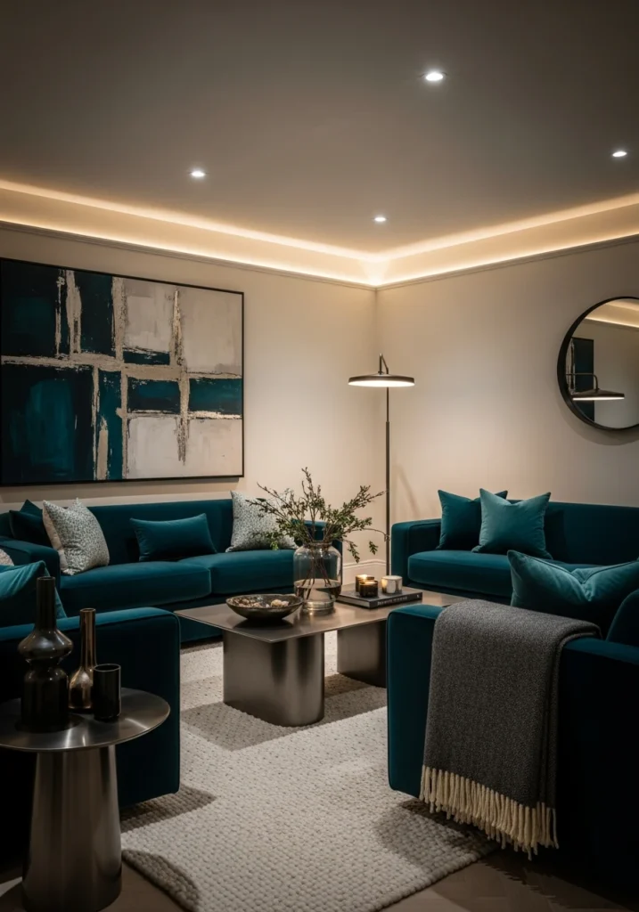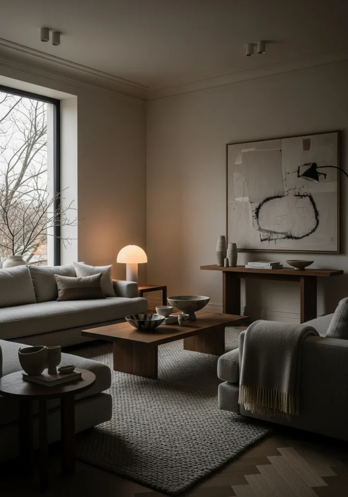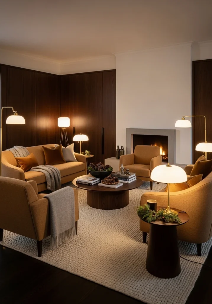 Tailored upholstery and moody lighting create this cocooning effect perfect for January. Intentional spacing prevents the room from feeling cluttered despite the rich palette. This combination creates intimacy without visual noise.