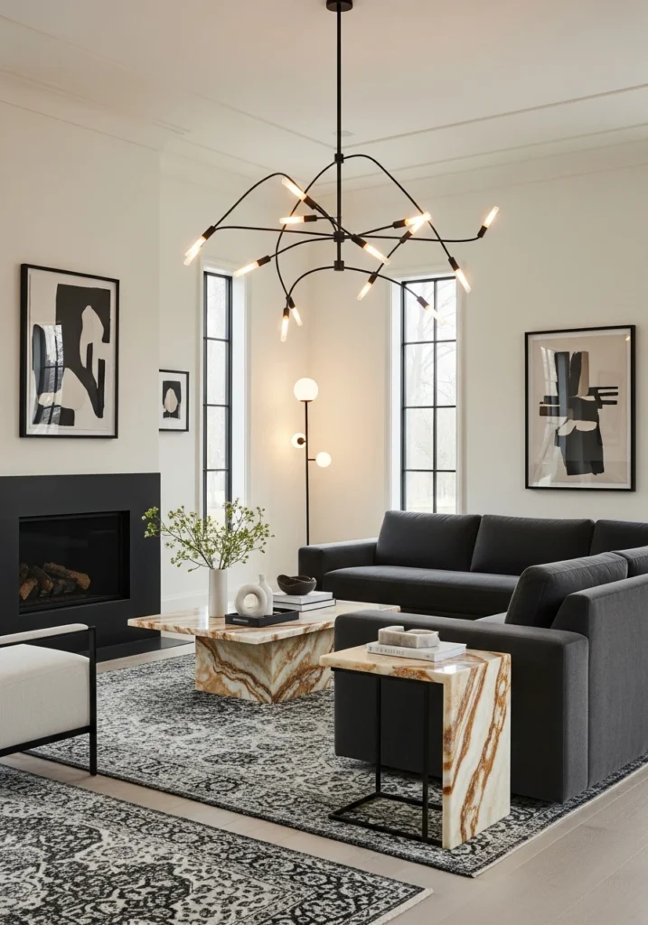 High ceilings get even more dramatic with ivory limewashed walls creating this soft backdrop for deep shadow-grey sectional seating. Polished onyx accent tables bring that luxe contrast without making the room feel heavy. Tailored wool rugs ground everything while sculptural lighting adds architectural interest.