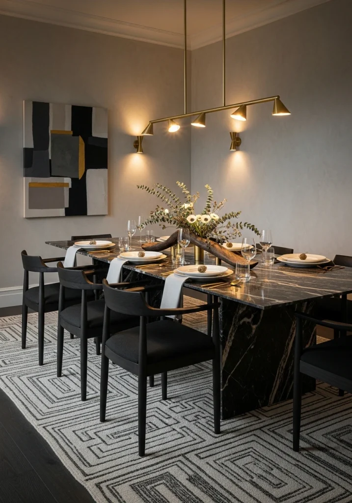 Subtle textural contrasts throughout elevate what could be a simple color scheme into something dramatic yet balanced. This modern palette works for January dining rooms that want sophistication without stuffiness. The brass prevents the grey tones from feeling cold.