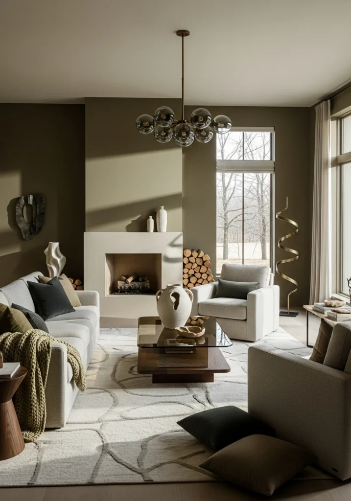 Finally, a winter palette with some green. Muted olive accent walls bring unexpected depth, while stone-beige upholstery keeps things grounded and calm. Smoked glass elements add that contemporary edge and subtle transparency.