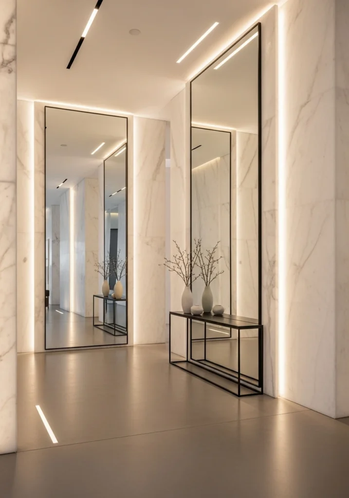 Oversized mirrors amplify light and space. Architectural lighting emphasizes the clean lines throughout. This palette creates the kind of refined January entryway that sets the tone for the entire home. Strong, polished, and completely intentional.